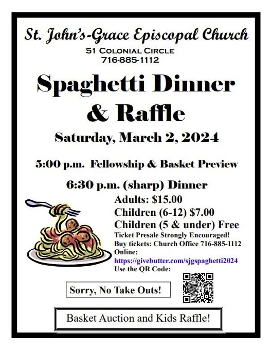 Please come out and support St. John’s-Grace at the Annual SpaghettiDinner. Doors open at 5 pm for Fellowship, Basket Bidding and Children’s Raffle. Dinner is served promptly at 6:30 pm Dinner includes: Bread and Butter, Salad, Spaghetti with vegetarian sauce, Meatballs, served family style, ice cream and beverages.